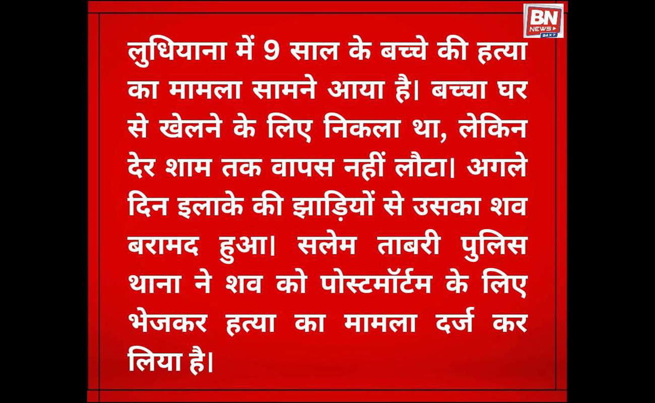 A case of the murder of a 9-year-old child has come to light in Ludhiana. The child had gone out to play but did not return home till late evening. The next day, his body was recovered from bushes in the area. The Salem Tabri police station sent the body for post-mortem and registered a murder case.