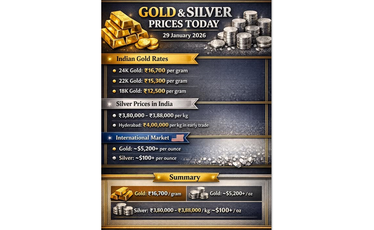 On January 29, 2026, gold and silver prices remained strong. 24-carat gold was priced at ₹16,700 per gram, 22-carat at ₹15,300, and 18-carat at ₹12,500 per gram. Silver traded between ₹3,80,000 and ₹3,88,000 per kg. In the international market, gold hovered around $5,200+ per ounce, while silver was near $100+ per ounce.