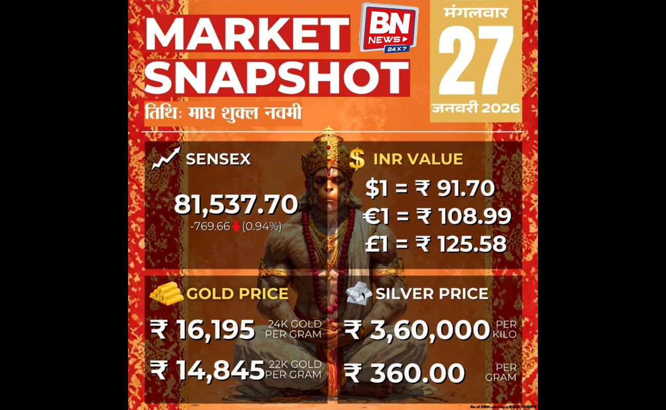 27 जनवरी 2026 को शेयर बाजार में गिरावट दर्ज की गई। सेंसेक्स 81,537.70 पर बंद हुआ। डॉलर ₹91.70, यूरो ₹108.99 और पाउंड ₹125.58 पर रहा। 24 कैरेट सोना ₹16,195 प्रति ग्राम जबकि चांदी ₹3,60,000 प्रति किलो दर्ज की गई।