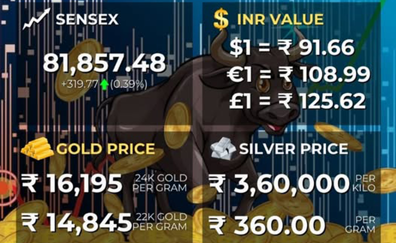 On January 28, 2026, the stock market showed gains with the Sensex closing at 81,857.48. The dollar stood at ₹91.66, euro at ₹108.99, and pound at ₹125.62. 24-carat gold was priced at ₹16,195 per gram, while silver traded at ₹3,60,000 per kg.