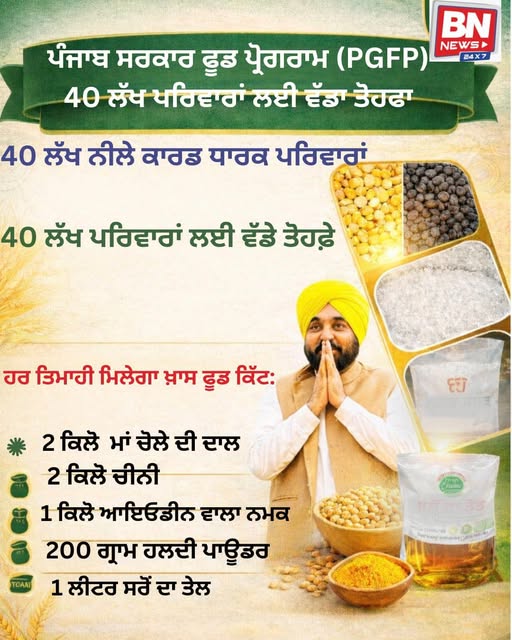 The Punjab Government has announced significant relief for nearly 40 lakh families under the Punjab Government Food Program (PGFP). The scheme aims to provide essential food supplies to needy households across the state.